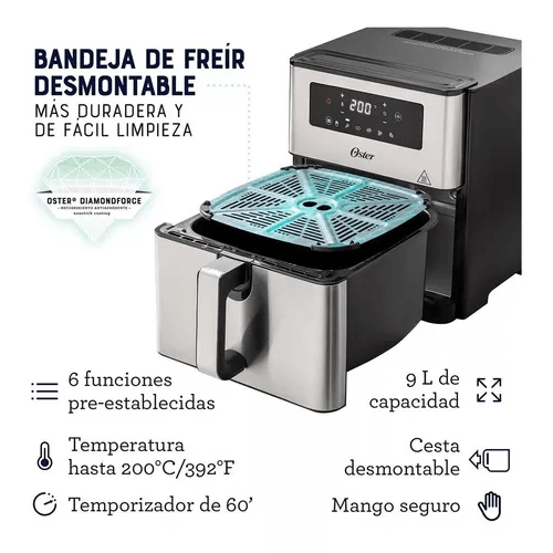 La freidora de aire Oster® con recubrimiento DiamondForce tiene una capacidad extra grande de 9L capacidad cuenta con un panel digital y 6 funciones pre programadas, para cocinar papas fritas, pollo, pescado, carne, pizza y hornear. Incluye una bandeja de freír con aire extraible con revestimiento antiadherente El revestimiento DiamondForce está infundido con partículas de diamante que la hace 12 veces más duradero y resistente a rayaduras y hasta 15 veces más fácil de limpiar