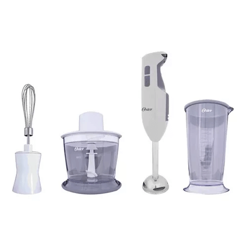 Las batidoras de inmersión Oster® permiten preparar una variedad de bebidas y recetas deliciosas, tales como sopas, puré de tomate, malteadas y mucho más. Además, es ideal para mezclar pequeñas cantidades de ingredientes, en la preparación de papillas para los niños, aderezos para ensaladas, o un simple smoothie. Mango ergonómico para seguir el contorno de la mano, de manera que sea más fácil su uso Control de velocidad variable para mayor versatilidad al momento de batir. Diseño exclusivo e Innovadora cuchilla con hoja y eje de acero inoxidable capaz de triturar hielo y licuar ingredientes más duros Incluye prácticos accesorios con tapas de doble función, batidores y picatodo, que permiten preparar y almacenar una gran variedad de recetas Función de turbo para lograr una mezcla más homogénea.